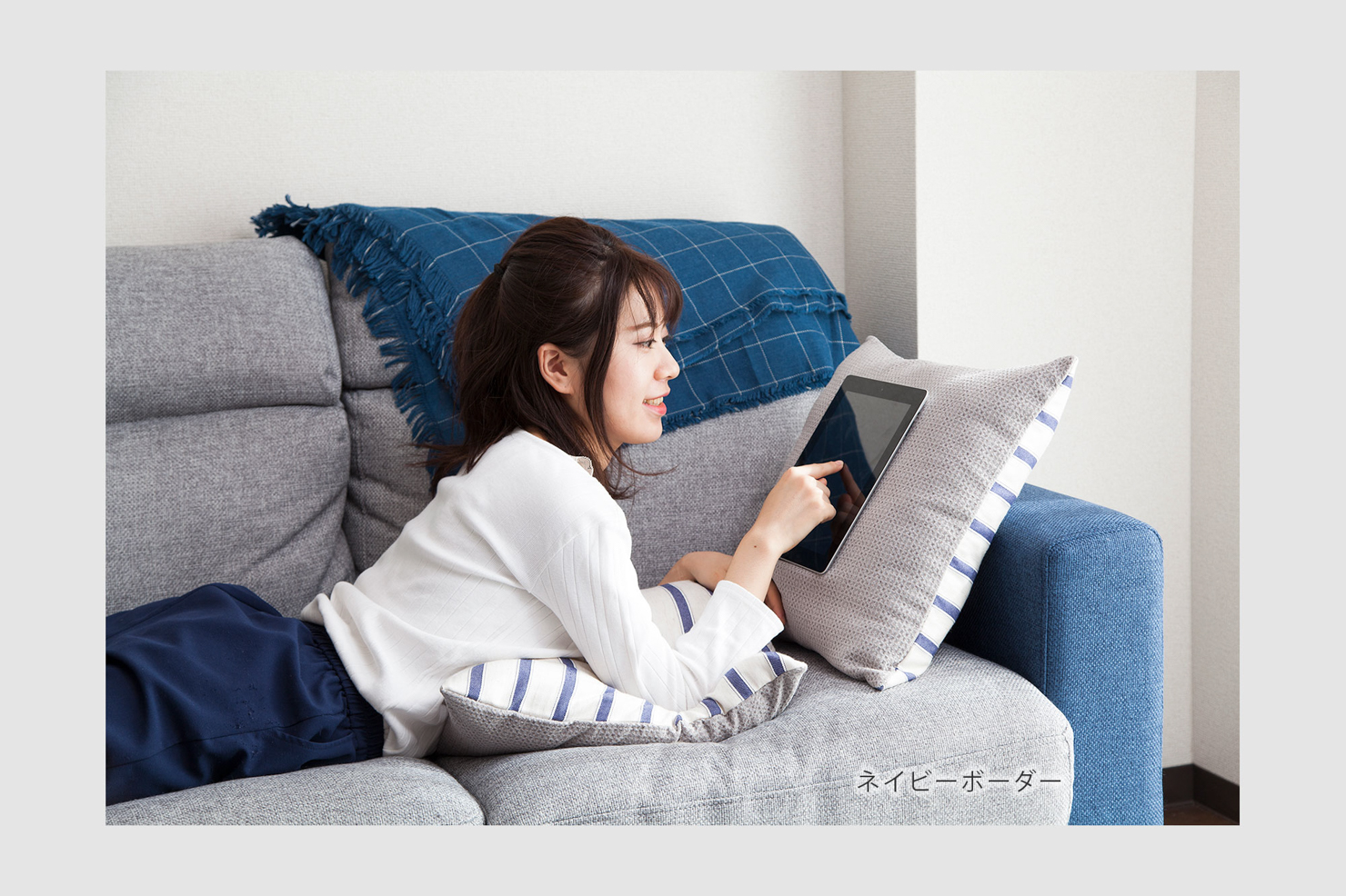 くつろぎに欠かせないクッションに、うれしい機能が付きました。雑誌やタブレットがやわらかいクッションの上でもすべらないので、リラックスしながら見ることができます。 寝そべった姿勢や膝の上で使うのに便利。くつろぎのお供に、TOMARU CUSHION COVER (ボーダー)。